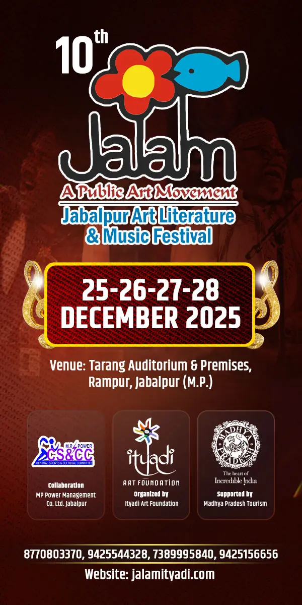 JALAM X is the 10th edition of Jabalpur Art, Literature & Music Festival, a landmark cultural event celebrating a decade of artistic dialogue. It is a first-of-its-kind public art movement that brings together art, literature, music, theatre, cinema, and intellectual exchange to foster creativity, sensitivity, and cultural consciousness.